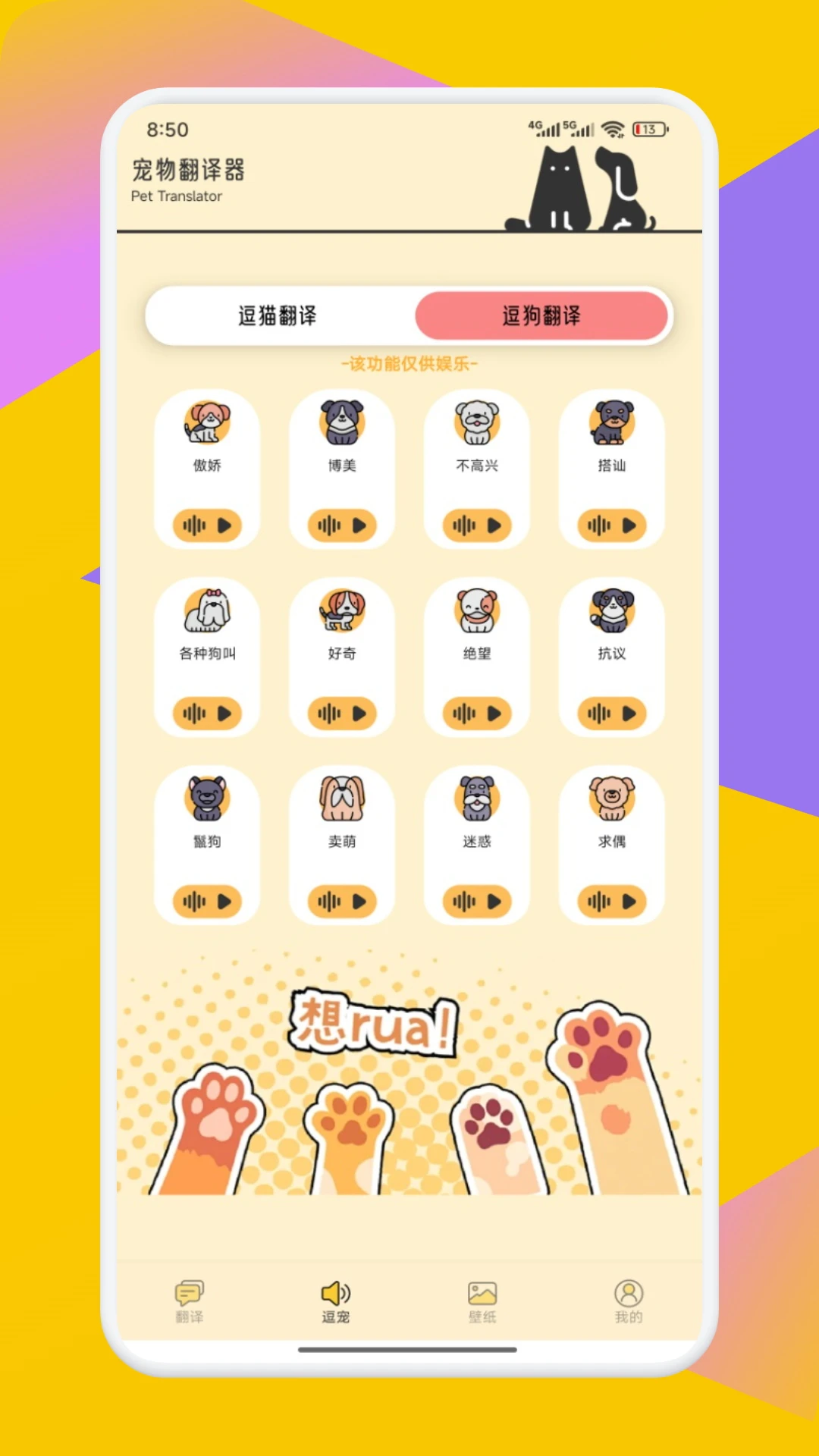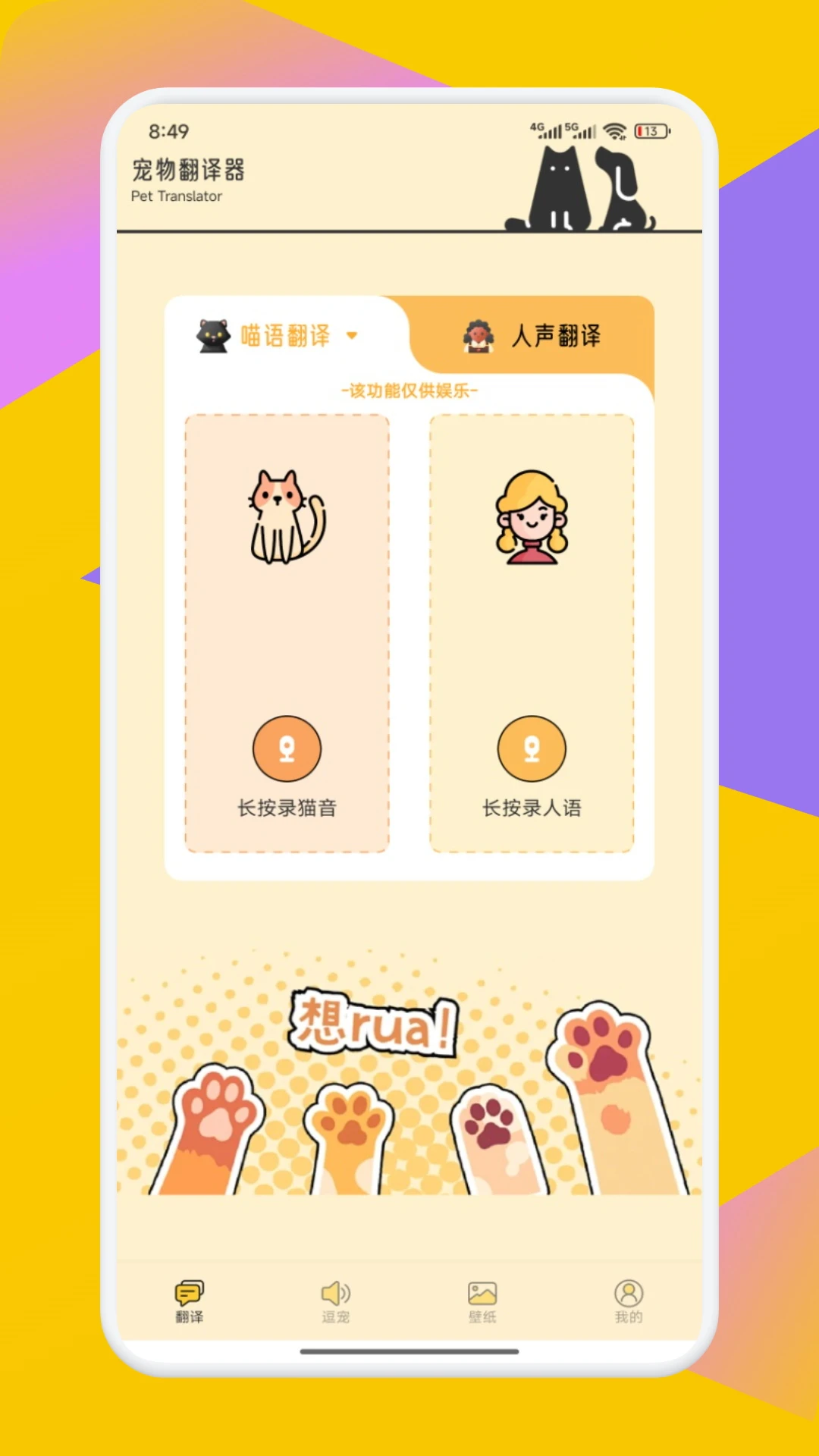款宠物翻译器App帮你实现!支持喵语、人声互译,长按即可录音互动,还有逗宠专区,丰富的猫咪、狗狗模拟音效,轻松逗乐萌宠。更有可爱宠物壁纸,装点你的屏幕。无论是增进与宠物情感,还是获取趣味互动,都能满足,快来开启奇妙的宠物交流之旅~(功能仅供娱乐)