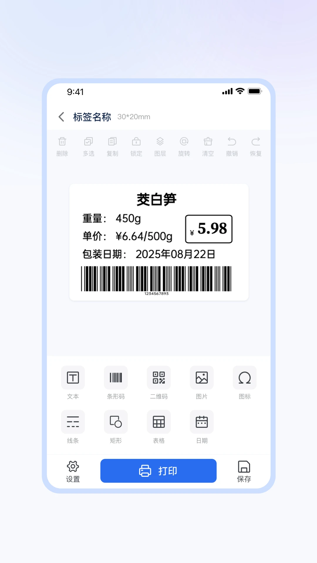 支持自定义标签,可插入文字,图片,条形码,二维码,日期,表格,图标等丰富的素材自行创建。