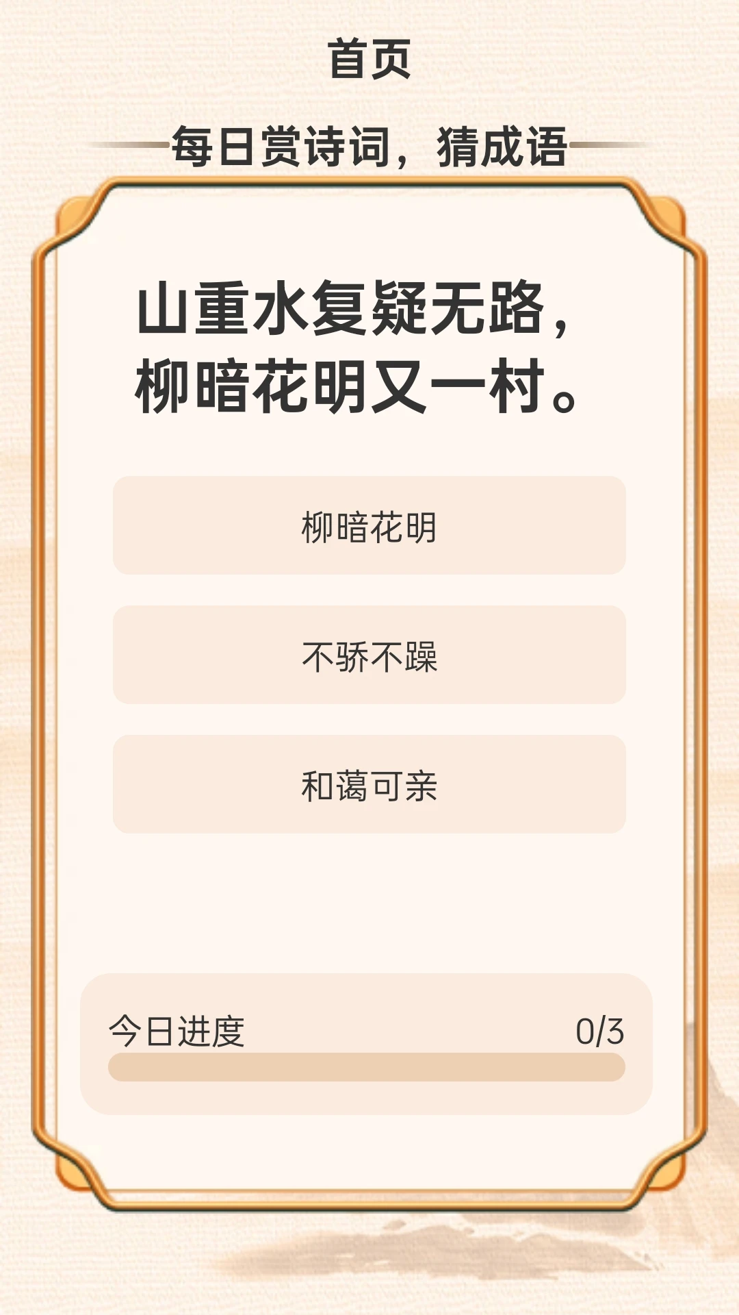 【每日赏诗词,猜成语】:,每天为您呈现一首优美的诗词,如“山重水复疑无路,柳暗花明又一村”,然后让您从几个选项中猜出对应的成语“柳暗花明”。