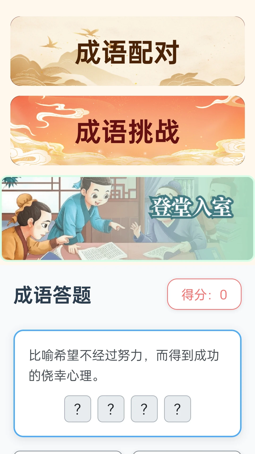 成语答题挑战,根据释义选择正确成语,检验学习成果。