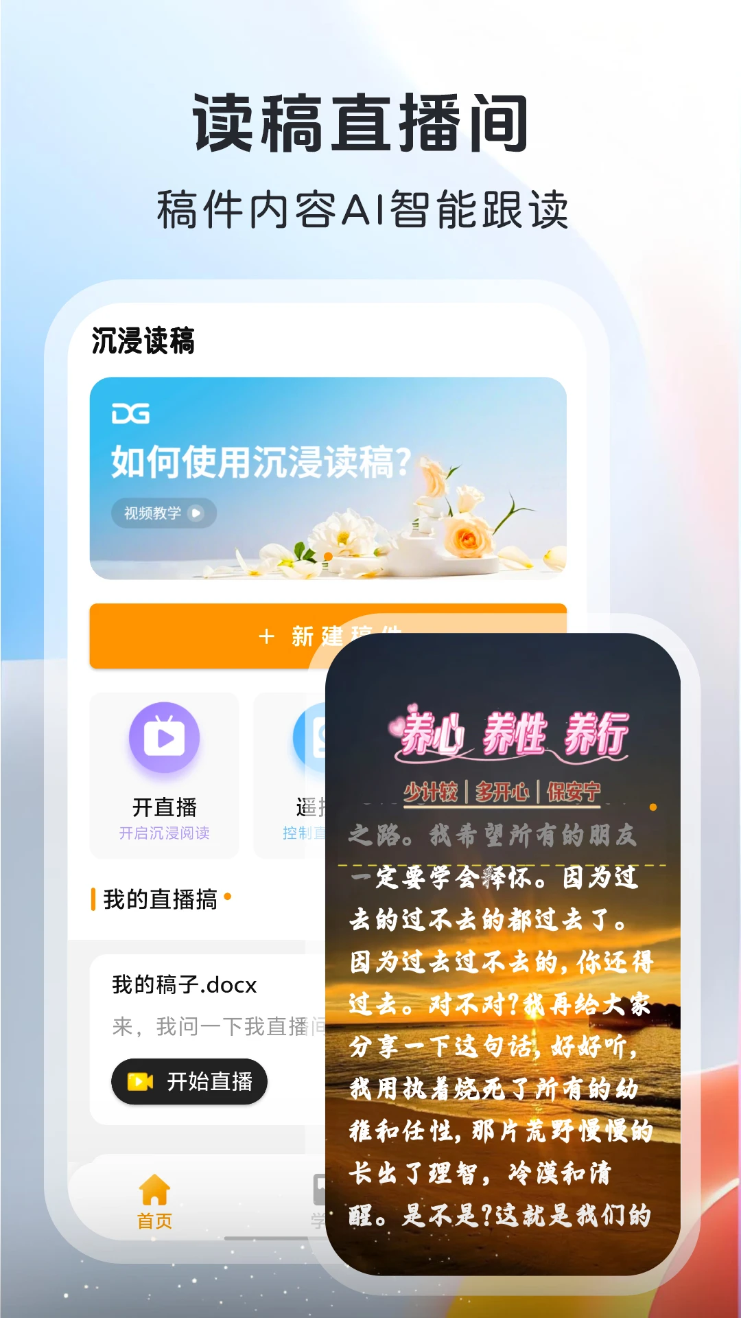 沉浸读稿,用于搭建沉浸式读稿直播间,如果你有两台手机,那你一台手机作为直播的手机,一台手机作为看播手机,再搭配沉浸读稿实体遥控器,就可以搭建直播间啦。如果你没有实体遥控器,但是你有三台手机,你也可以搭建不露脸直播间,一台手机作为直播手机,一台手机作为遥控器手机,一台手机作为看播手机就可以了,如果你不会操作,我们都是有视频教学的,你可以看视频学习使用,感谢你对我们的支持,我们会越做越好的。