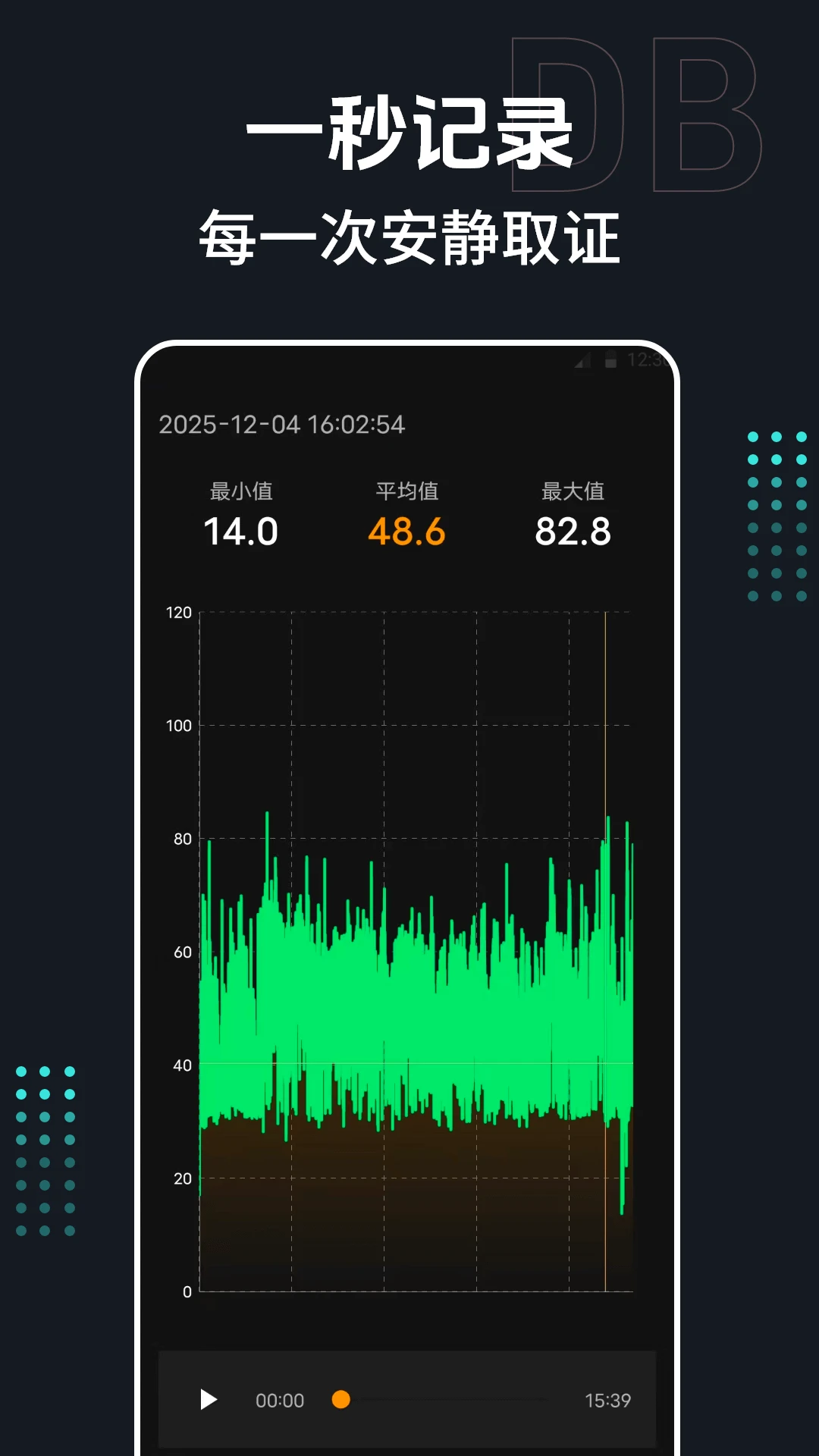 实时噪声监测:通过设备麦克风捕捉环境声音,即时显示当前分贝值,精度可达±1.5dB。