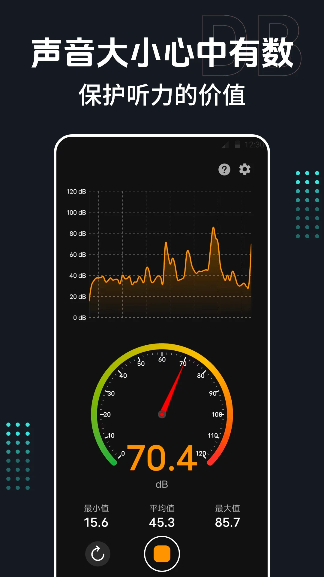 使用设备麦克风实时测量环境分贝值,数据精准可靠。