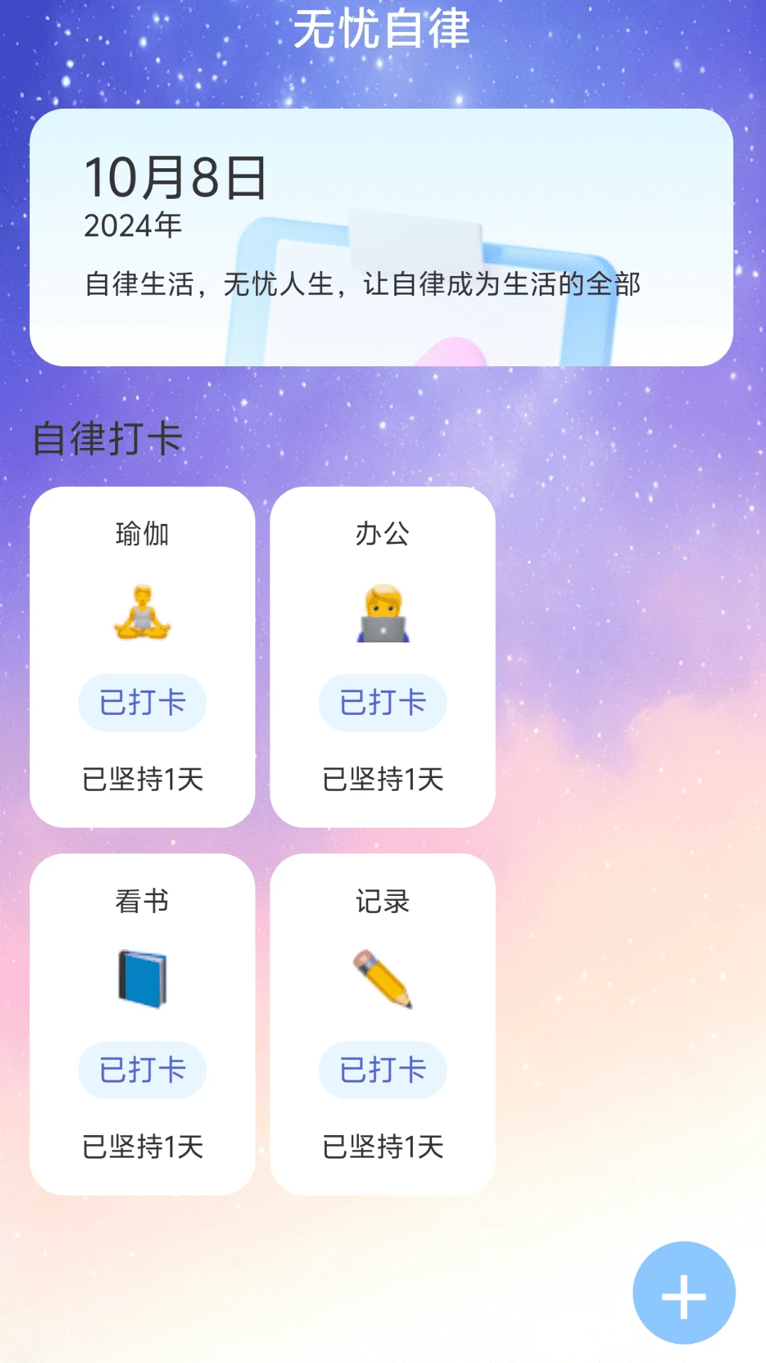 自律打卡支持多目标同时设定,涵盖学习、健身、阅读等多个生活领域。