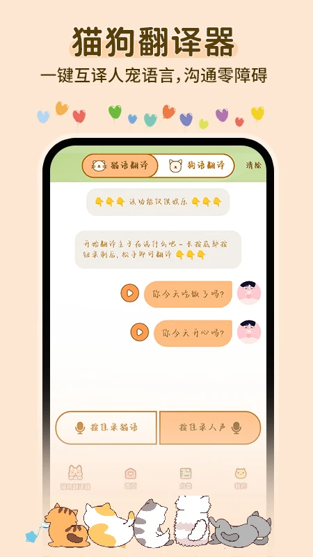 人猫狗对话翻译器是一款专为宠物爱好者设计的趣味工具,旨在拉近主人与爱宠之间的距离。通过智能算法模拟动物语言逻辑,它能将狗狗的吠叫、猫咪的呼噜声转化为人类可理解的文字表达,同时也能将主人的语音转换成宠物可能理解的声波信号。无论是想解读毛孩子的小情绪,还是向它们传递关心,这款软件都能成为跨越物种的沟通桥梁。其简洁的界面设计和即时互动的特性,让每一次"对话"都充满惊喜与温暖,为养宠生活增添别样乐趣。