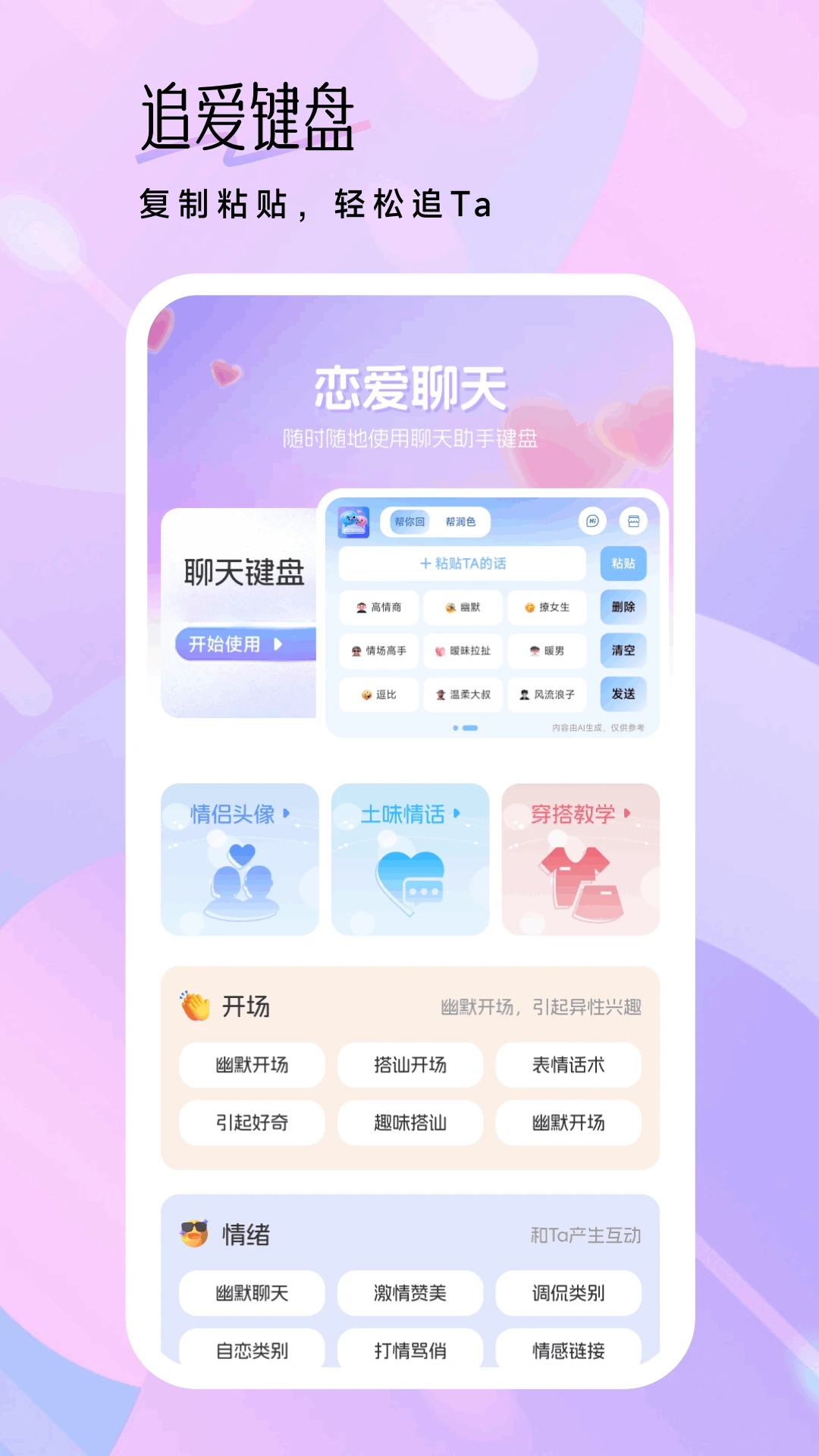 智能聊天助手实时分析对话场景,提供个性化回复建议内置AI输入法键盘,支持快捷调取高频恋爱用语库
