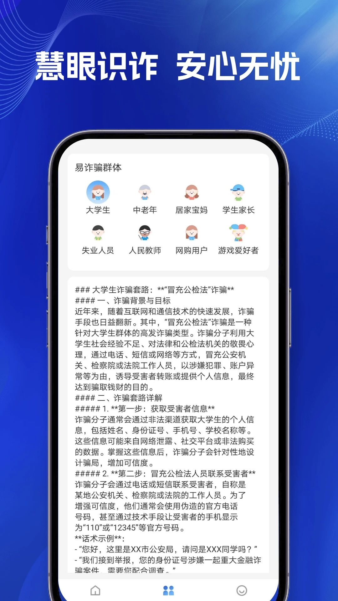 防诈知识:提供丰富的防诈骗知识和易受诈骗人群,帮助用户了解新的诈骗手段和防范方法。