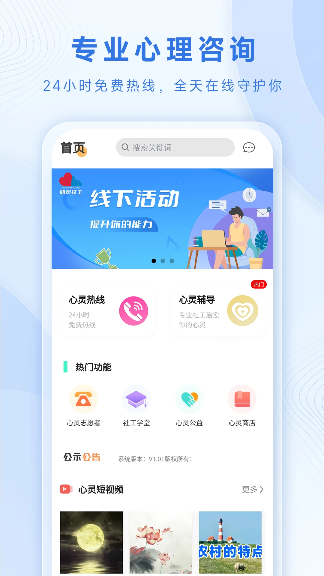 心灵社工APP是一款专注于心理健康服务的专业平台,由高校专家团队联合全国资深心理咨询师、社会工作师共同打造。该平台创新性地融合"互联网+心理健康+社会工作"模式,通过线上咨询与线下服务相结合的方式,为用户提供便捷、专业且普惠的心理辅导服务。无论是个人情绪管理、家庭关系调解,还是职场压力疏导,心灵社工APP都能提供全方位的心理支持,让专业心理健康服务触手可及。