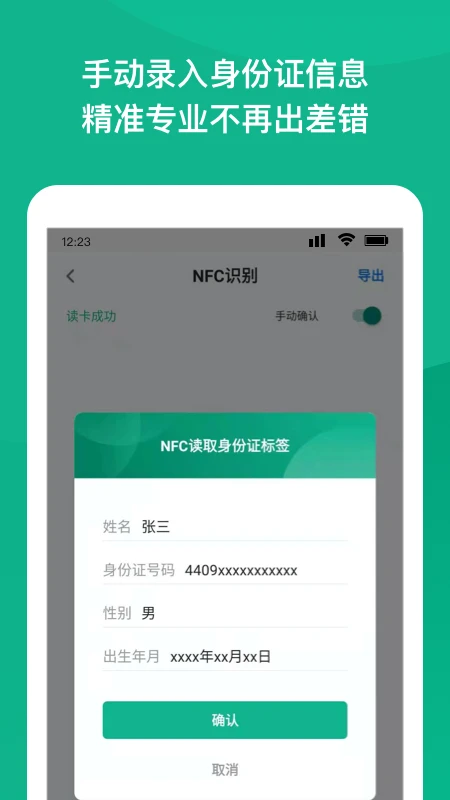 NFC读取身份证功能,只需将手机贴近身份证,即可快速读取证件信息,无需手动输入。