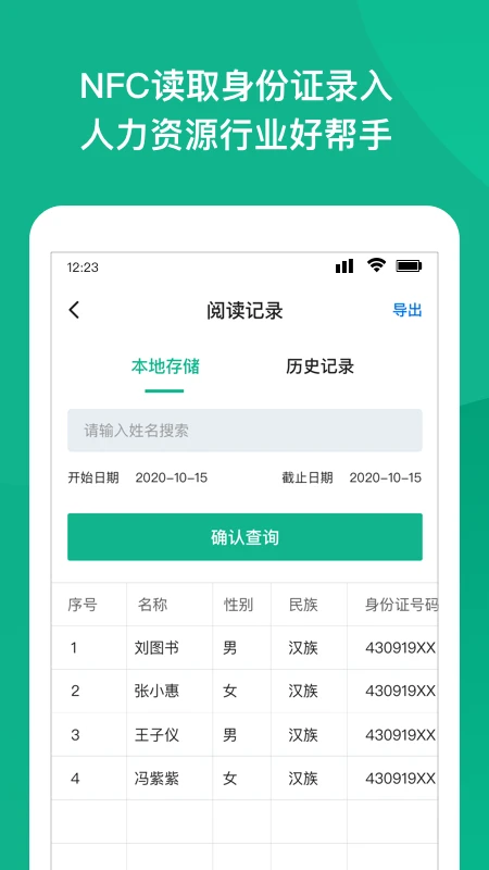 NFC身份证扫描是一款专门为人力资源,劳务派遣,导游,会计等需要大量登记人员信息的行业提供方便快捷的录入工具,