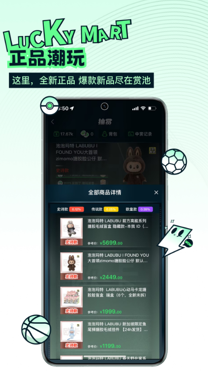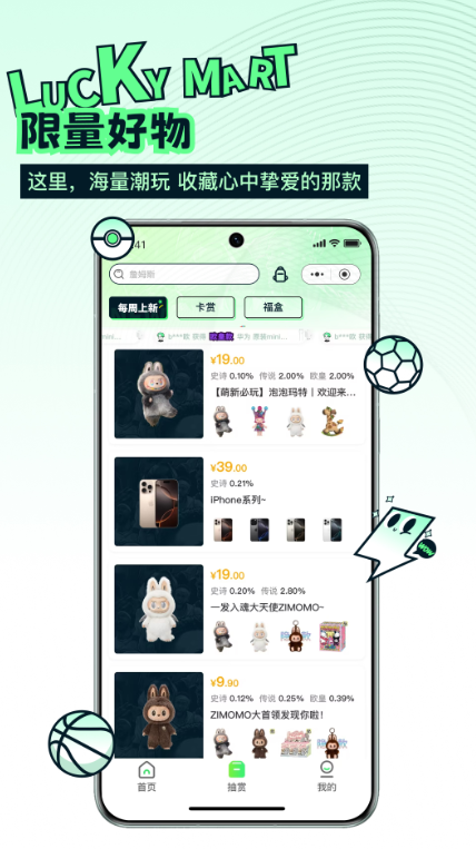 进入首页后,用户可以通过直观的分类导航浏览各类潮玩商品,包括热门IP专区、新品首发区等。每个商品卡片都配有高清图片和关键信息,滑动屏幕即可快速预览多款商品,找到心仪目标。