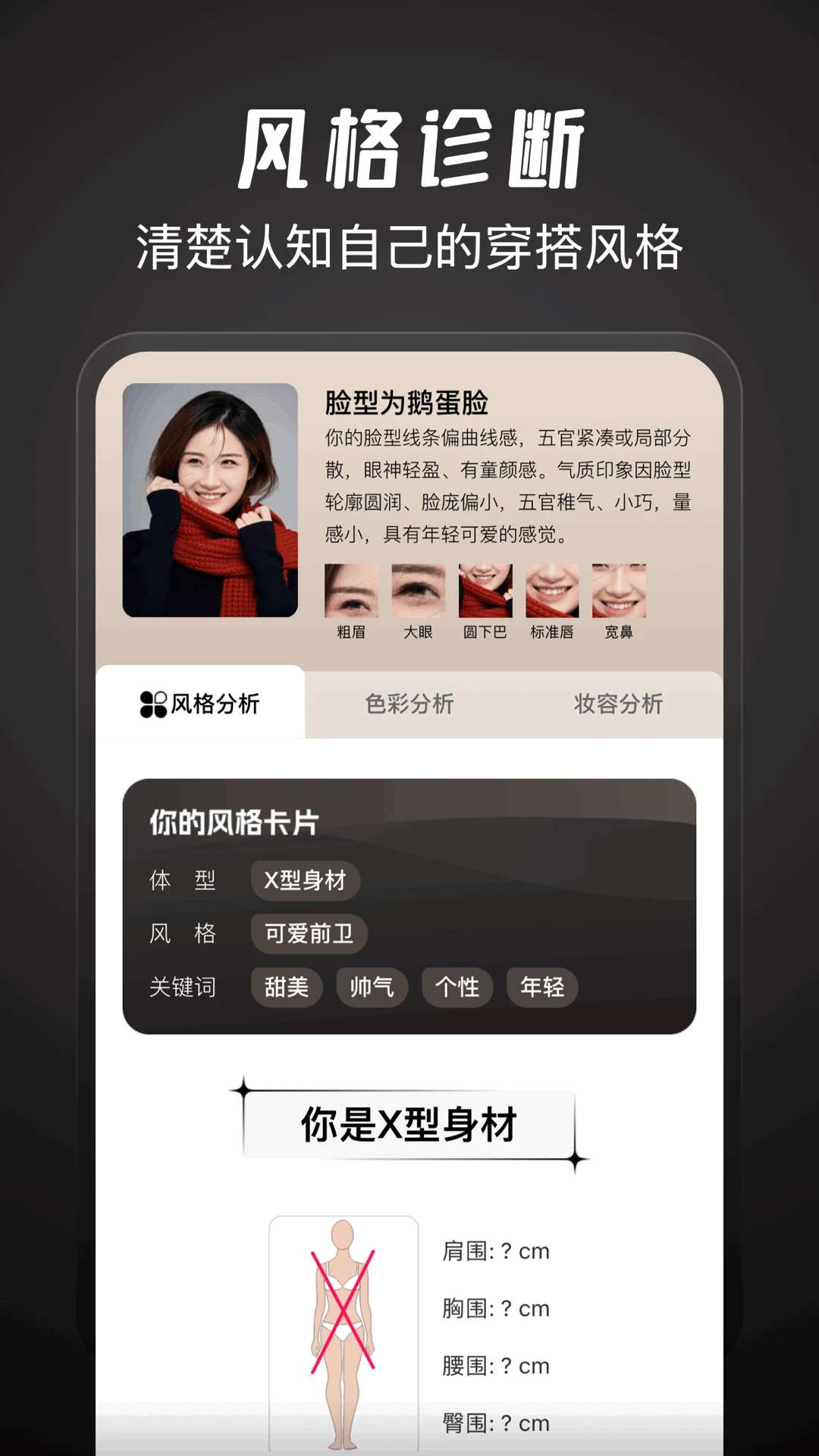风格诊断系统:通过AI算法分析用户外形特征,科学判断最适合的穿搭风格,如优雅、前卫或自然等。
