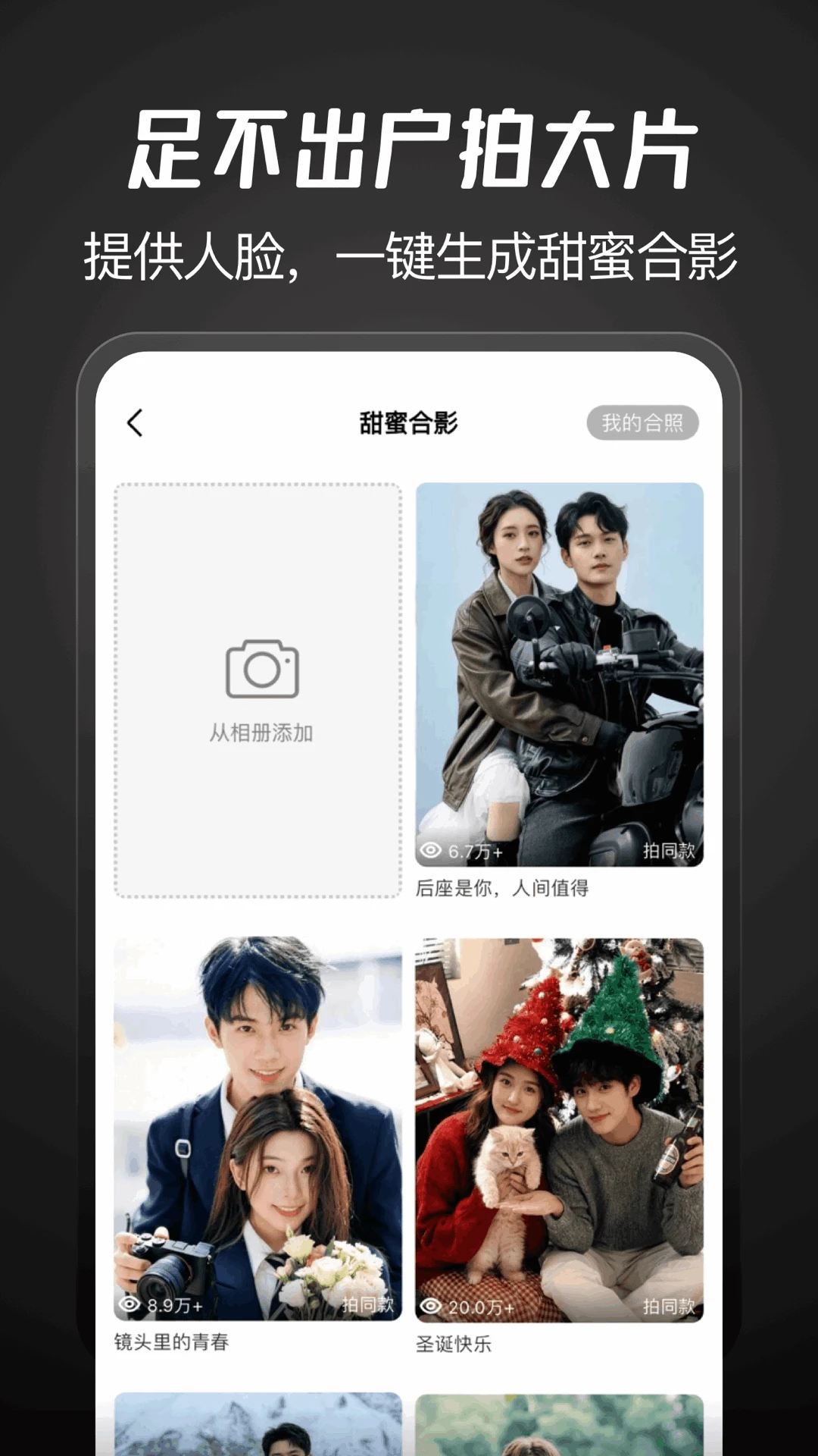 上传两张人脸,为您定制专属甜蜜合照,解锁你们从未尝试过的各种穿搭与场景。