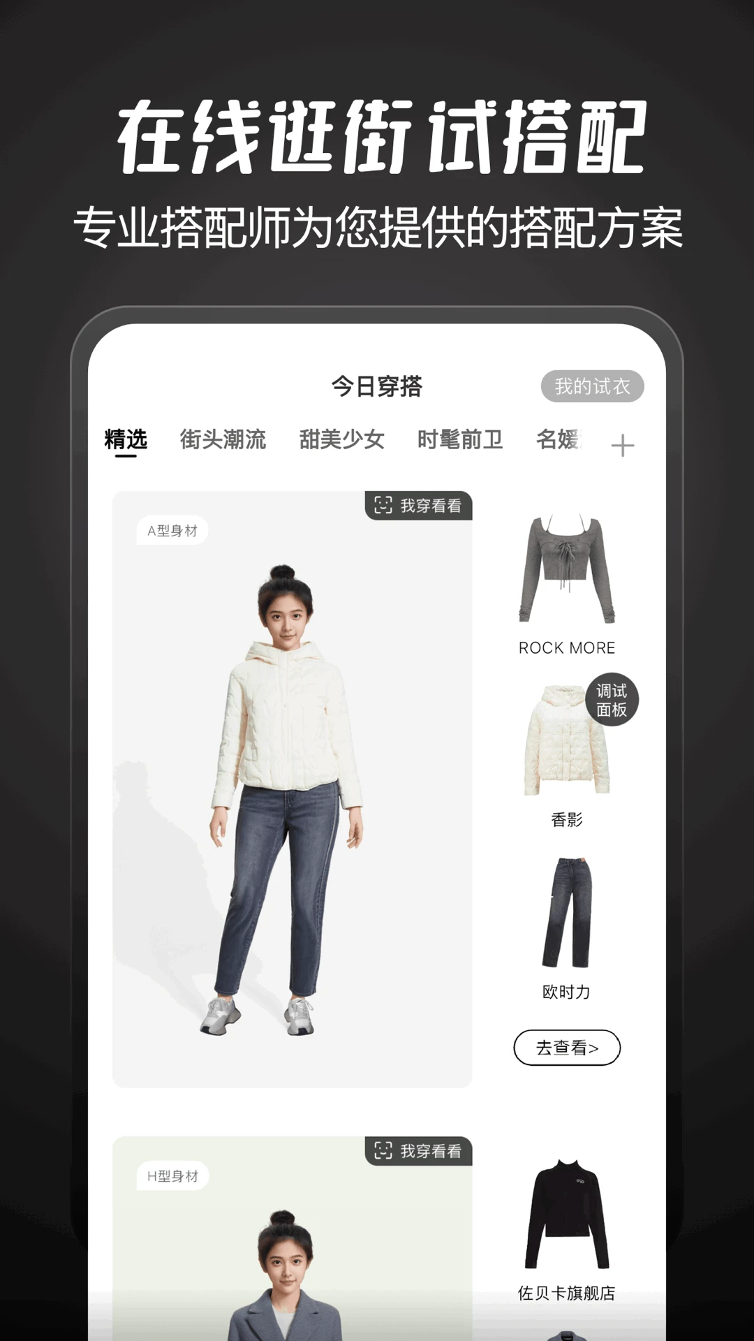 根据你的身材和喜好,每天为你定制专属搭配,点击「我穿看看」,模特搭配一键上身