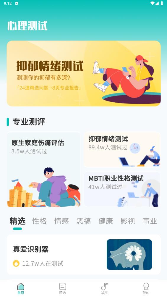 【心理测试】涵盖抑郁情绪测试、职业性格测试、原生伤痛评估等专业测评项目,帮助您发现未知的自我。每个测试都经过心理学专家精心设计,确保结果的科学性和可靠性。
