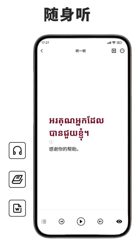 地道发音示范:聘请柬埔寨专业播音员录制音频。每个单词配套慢速、常速两种发音模式,帮助掌握正确发音技巧方法。发音示范包含单词和例句,让学习者了解词汇在实际语境中的运用。