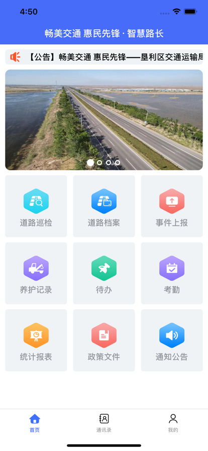 智慧路长APP是一款专业化的道路综合管理服务系统,致力于为公路管理部门提供全方位的数字化解决方案。该系统集成了道路巡检、道路档案管理、事件上报、养护记录、待办事项、考勤管理、统计报表、政策文件查阅、通知公告发布等多项核心功能,实现了公路建设、管理、养护、运营的全流程覆盖。通过智能化的数据采集与分析,系统能够快速上报公路检测数据,并在异常情况发生时及时触发报警机制,让道路养护工作更加高效、精准、智能化。