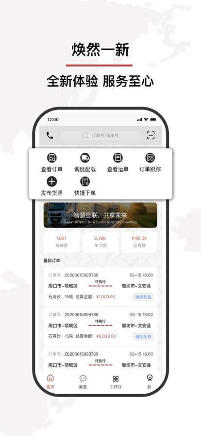 中物货运app以智能化、便捷化为核心理念,打造了完整的掌上物流闭环系统。平台采用简洁直观的界面设计,主要分为【首页】、【消息】、【工作台】、【我】四大功能模块,每个模块都经过精心优化,确保用户能够快速上手。首页提供货源信息展示和运力匹配功能;消息中心实时推送订单状态变更;工作台集成了各类实用工具;个人中心则方便用户管理账户信息。这种模块化设计让物流管理变得更加轻松高效。