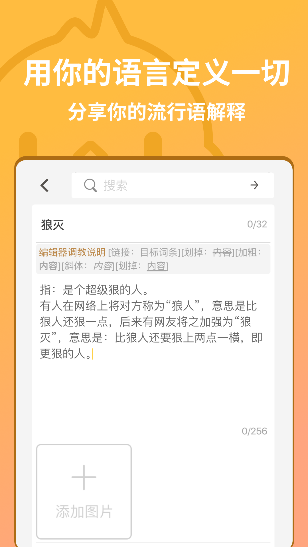 超级全面的网络百科条目知识,没有你找不到的,涵盖从网络热词到亚文化术语的方方面面;帮助有代沟的人们一起走向这个创新的大世界,让不同年龄层的用户都能找到共同语言;记录每一个流行语,见证最真实的历史文化变迁,成为网络语言发展的活字典。