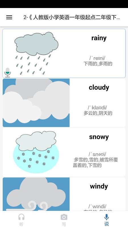 《我说你写》是一款专为儿童设计的英语学习软件,完美适配PEP版一年级英语教材。该软件不仅提供完整的电子版教材内容,还通过生动有趣的图文结合方式,帮助孩子轻松掌握课本中的英语单词。每个单词都配有精美的插图,让孩子在观察图片的过程中自然而然地学习英语,这种视觉化学习方式不仅能激发孩子的学习兴趣,还能有效加深记忆。此外,软件还支持实时英语单词音频播放功能,孩子可以随时聆听每个单元的标准发音,全方位满足一年级学生的英语学习需求。