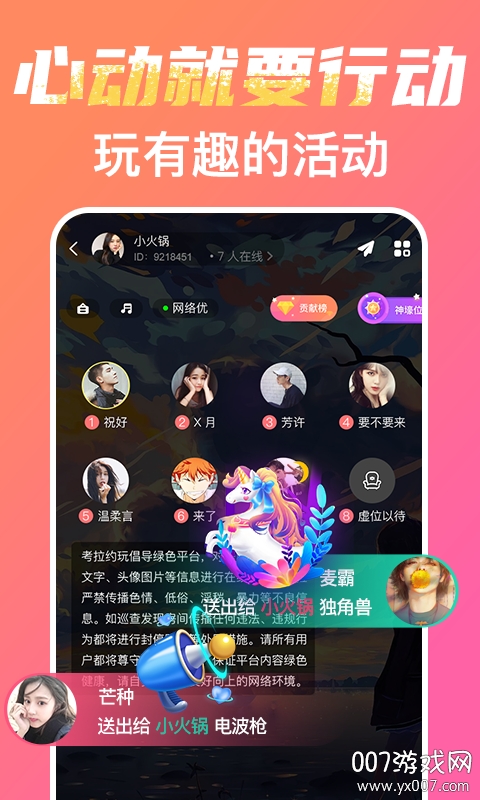 软件提供丰富的语音交友功能,支持变声、混响等多种音效切换。你可以创建私人聊天室或加入主题房间,结识志趣相投的朋友。系统会根据你的聊天习惯智能推荐可能感兴趣的话题和用户,让每次交流都充满新鲜感。