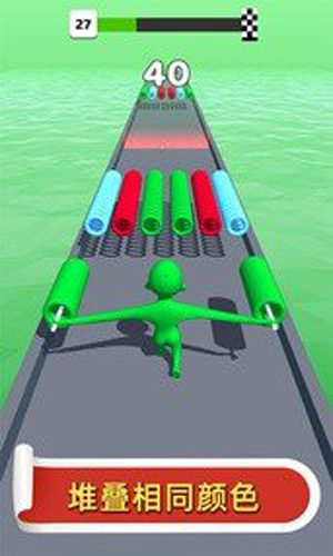 游戏开始时,玩家需要按照箭头指示操控绿色小人沿着跑道前进。在前进过程中,要注意收集沿途的绿色道具,这些道具不仅能增加分数(如+2分),还是延长手臂长度的关键。随着游戏推进,角色会变成蓝色小人,这时玩家需要更加谨慎地躲避红色道具,同时继续收集绿色道具来提升分数(如达到71分)。游戏的操作虽然简单,但需要玩家保持高度的专注力才能顺利通关。