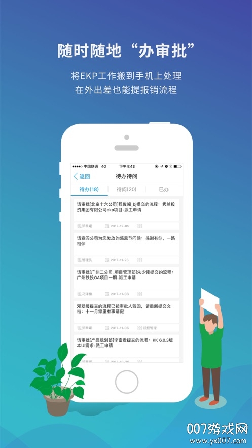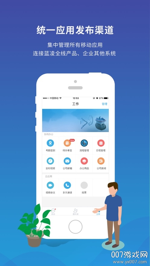 【移动办公】通过和企业现有的IT对接,重新定义移动化使用场景,快速实现移动办公,支持流程审批、任务分配等核心办公功能;