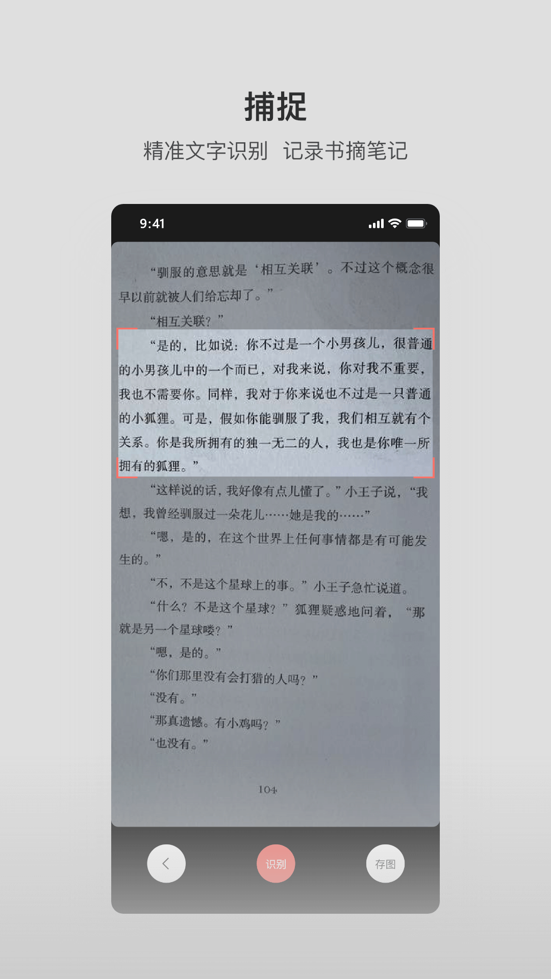 捕捉功能:精准识别书籍内容,快速记录书摘笔记,支持多种格式标注