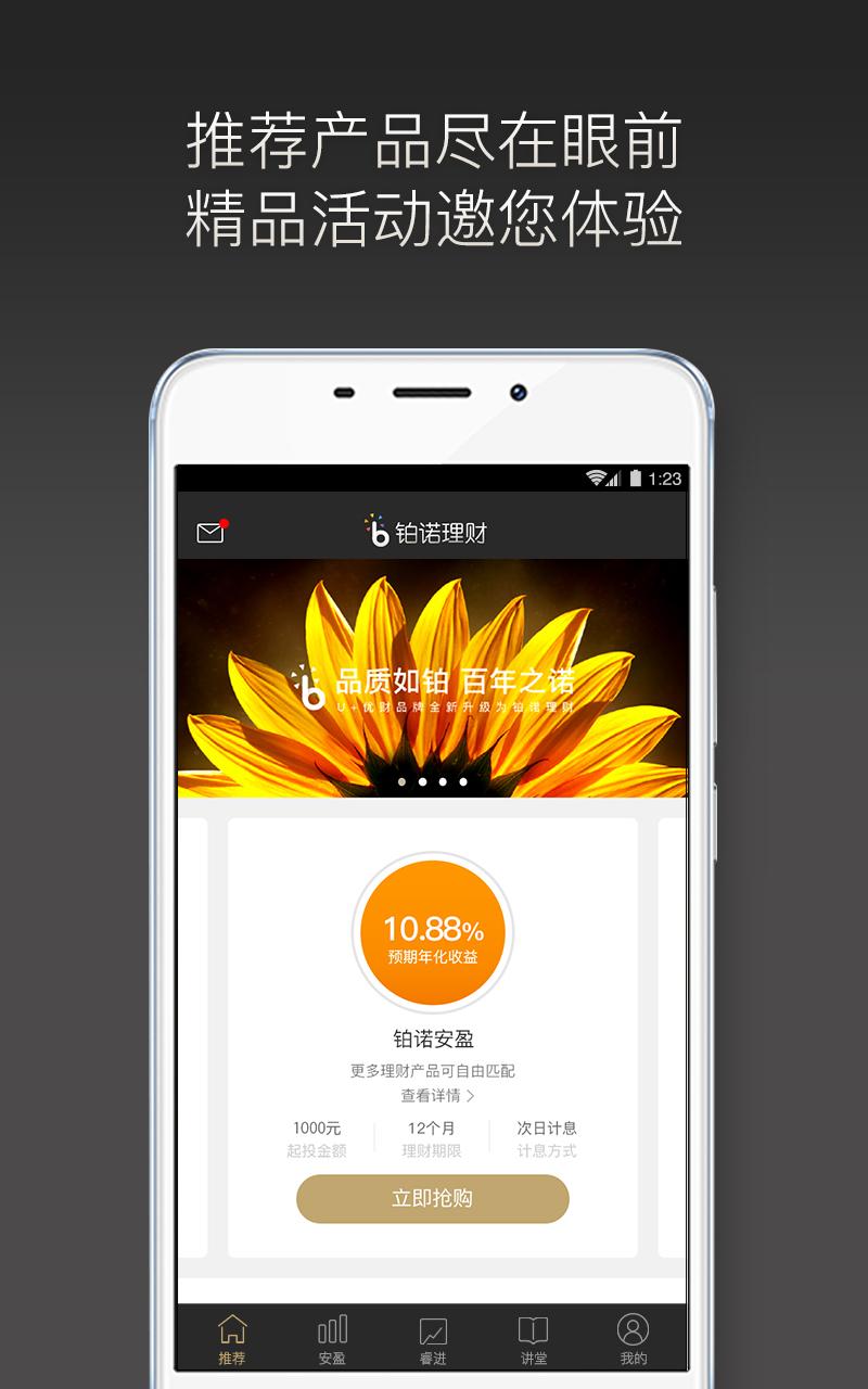 铂诺理财APP是北京优势财富科技有限公司于2015年推出的一款互联网金融服务平台,致力于为用户打造便捷高效的私人银行体验。该平台由80后知名基金经理简毅创立,并获得了创新工场李开复的投资支持,以科技金融为核心,为用户提供多样化的理财服务。铂诺理财不仅注重收益,更强调安全与透明,通过专业的团队和严格的风控体系,帮助用户实现财富增值。无论是稳健型还是进取型投资者,都能在这里找到适合自己的理财产品,享受个性化的金融服务。