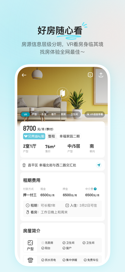 贝壳租房平台致力于打造真实、便捷、高效的租房体验,汇聚全国海量优质房源,涵盖整租、合租、独栋等多种租赁形式。平台通过智能算法精准匹配用户需求,提供VR看房、在线咨询、房源订阅等创新功能,让找房过程如同亲临现场。每日更新的租房干货、社区动态和行业资讯,帮助租客全面了解市场信息。无论是首次租房还是换房需求,贝壳都能以清晰的房源分类、透明的价格体系和专业的经纪人团队,为用户提供从选房到签约的一站式服务,让租房变得更简单、更安心。