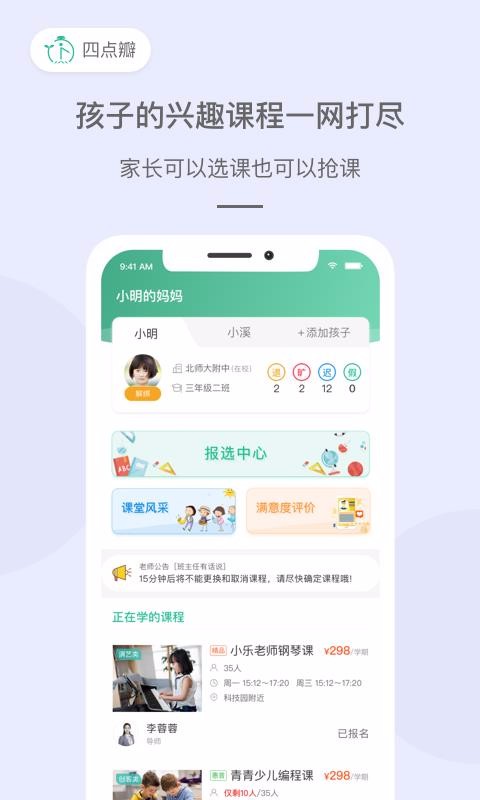 《四点瓣教师版》是一款专为教师设计的智能教学管理软件,致力于提升教学效率与课堂互动体验。通过该平台,教师可实时掌握学生选课与出勤情况,轻松管理班级事务。软件支持多媒体教学资源上传,包括视频、图片和文字材料,方便教师展示课堂风采并与家长分享教学成果。独特的课堂点名功能一键完成考勤,节省宝贵教学时间。同时,系统提供个性化备课空间和教学计划编辑功能,让教学工作更加井然有序。