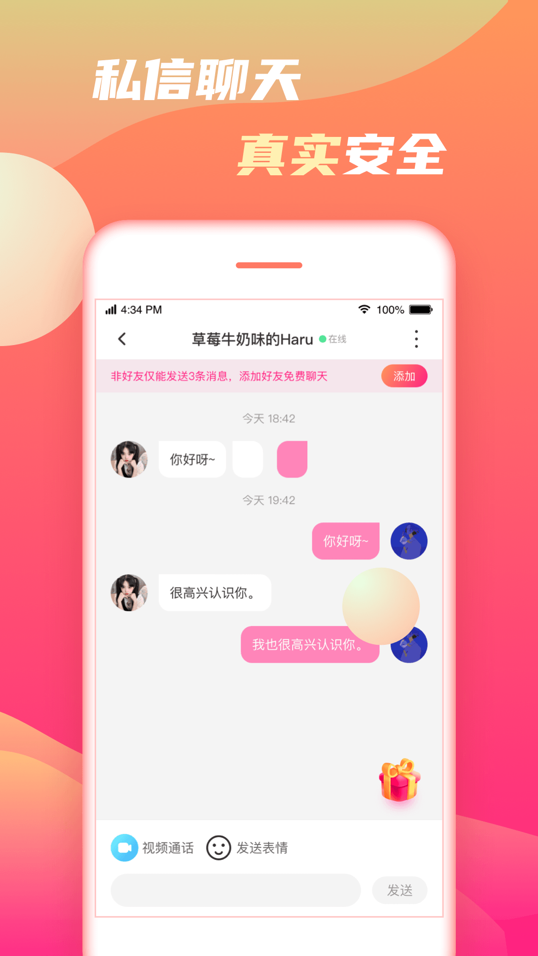 全天候视频聊天服务,采用高清码率传输技术,确保网络畅通无阻,让您的快乐时光不受网速和画质影响。在视频互动过程中,您可以赠送精心设计的虚拟礼物,每款礼物都蕴含独特含义,让情感表达更加丰富。平台礼物由专业团队打造,粉嫩可爱的设计风格深受用户喜爱。此外,私信功能完全开放,您可以随时向心仪对象发送友好问候,开启浪漫对话。