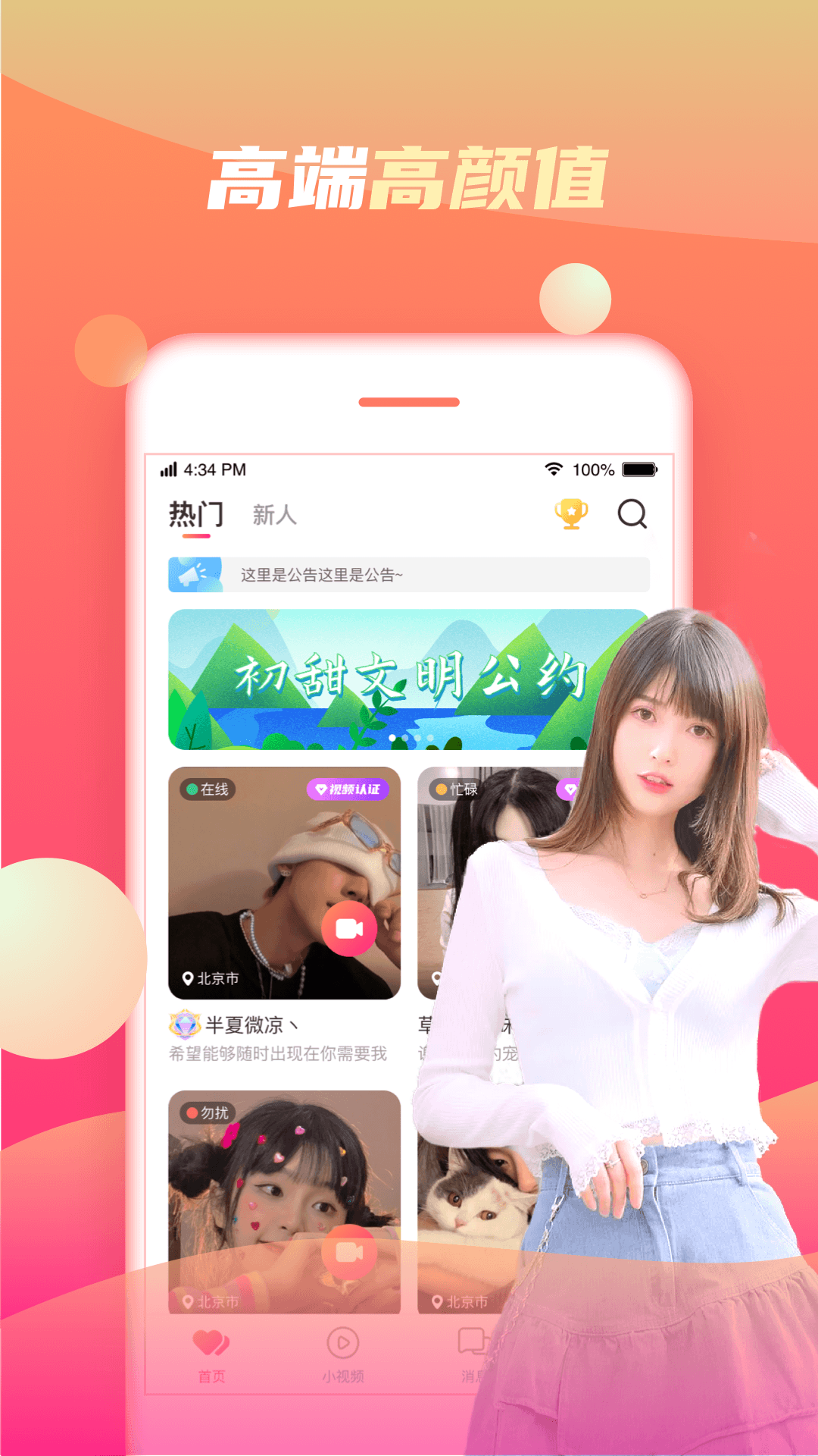 初甜APP是一款专为年轻人打造的社交交友平台,致力于为用户提供真实、高效、有趣的互动体验。平台汇聚了海量优质用户,通过严格的真人审核机制确保每位用户的真实性,让您告别虚假信息,享受纯粹的交友乐趣。无论是寻找心灵伴侣还是结识志同道合的朋友,初甜APP都能满足您的需求。多样化的社交功能,包括视频聊天、小视频广场、即时消息等,让沟通更加生动有趣。高清画质、流畅网络、贴心设计,为您打造完美的社交环境。快来下载初甜APP,开启您的浪漫邂逅之旅吧!