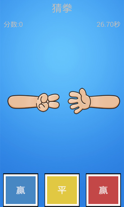 猜拳经典版是一款考验反应与判断力的敏捷类游戏。游戏基于传统"石头"、"剪刀"、"布"的胜负规则,创新性地加入了时间压力机制。玩家需要在不断缩短的限定时间内,快速判断并选择"左边赢"、"右边赢"或"平局"的正确结果。随着游戏进行,判断时间会越来越短,极大提升了游戏的挑战性和刺激性。游戏还设有多种难度模式和成就系统,让玩家可以不断突破自我,创造新的记录。快来接受挑战,看看你的极限反应速度能达到什么水平吧!