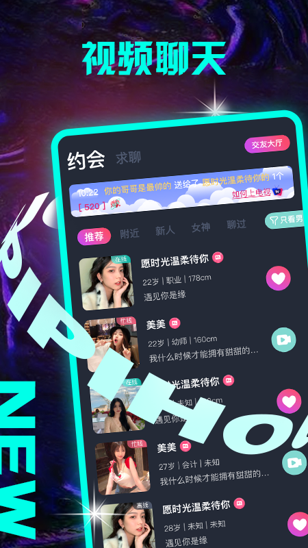 皮皮猴app提供全方位的视频交友功能,让您与有缘的TA进行面对面交流,分享那些只属于你们的小秘密。全新上线的心动模式,巧妙化解初次相识的尴尬,让您能够自然表达心意。从文字私聊到视频互动,皮皮猴app让交友过程更加真诚自然。作为海量单身人士的首选平台,我们鼓励用户用真心交朋友。通过视频聊天功能,您可以更全面、更深入地了解对方。同城热聊功能帮助您轻松找到附近的优质对象,自定义上线状态的约会玩法让您随时开启浪漫邂逅。同城约会功能将带您认识附近的有缘人,助您完美脱单。