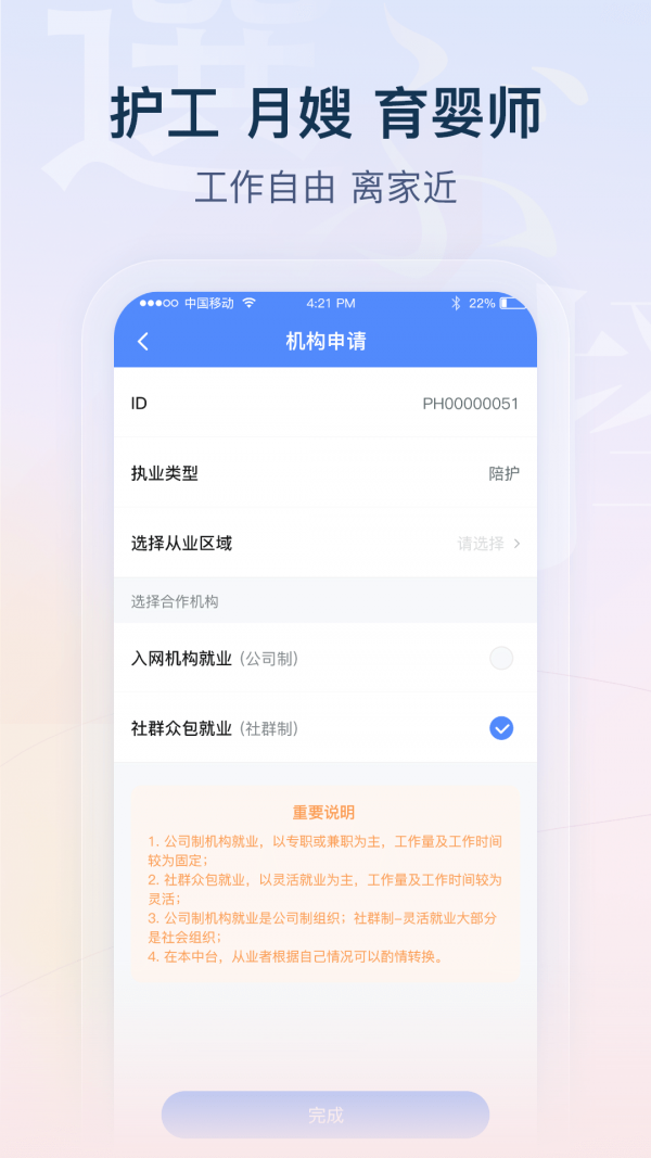 平台真正实现了从业者"工作自由离家近就业方便质量高"的就业愿望,让家政服务更加灵活高效。每日结算机制保障了从业者的资金安全,让收入更有保障。工作模式完全自主,用户可以根据个人情况自由选择接单时间和地点。平台提供全面的在线培训资源,帮助从业者不断提升专业技能。涵盖10多个大健康行业服务工种,为用户提供多元化发展机会。完善的信用评价体系让优质服务人员获得更多曝光和机会,提升行业整体水平。