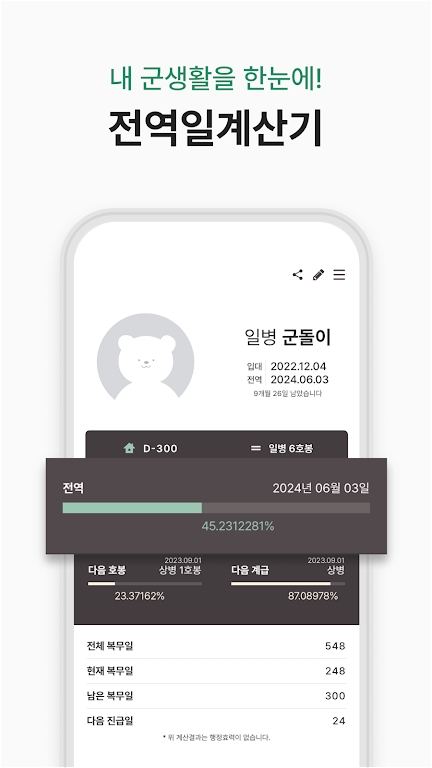 goondori由圣奇异果团队专为追星族打造,是一款功能强大的追星神器。其核心功能是精准计算服役时间,您不仅可以查询官方公布的服役期限,还能根据实际情况手动调整开始日期,获得最准确的退伍时间预测。所有数据都会实时更新,确保信息的时效性。除了追星外,您还可以用它记录家人朋友在韩国的服役情况。软件采用简洁直观的界面设计,支持同时追踪多个明星的数据,操作简单便捷,即使是初次使用的用户也能快速上手。
