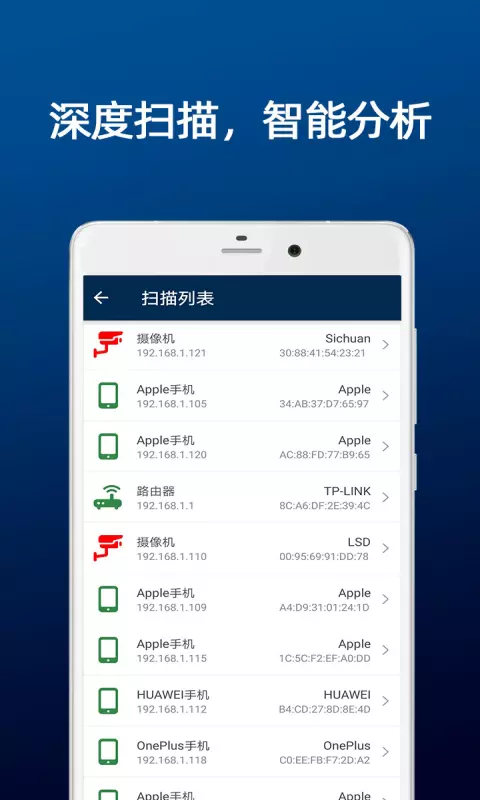 扫描出来的设备会以列表的形式展现,用户可以快速的进行查看。列表包含设备名称、信号强度等详细信息,便于判断风险等级。