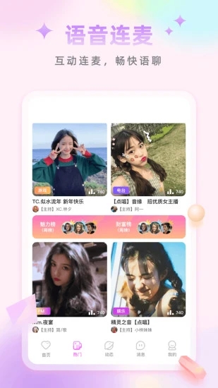 创新的声音交友模式让你可以结识各类声音达人:专业歌手、实力声优、魅力男神女神,总有一款声音能打动你的心。丰富的互动功能包括多人连麦、趣味互动游戏、边聊边唱等玩法,让社交更有趣。