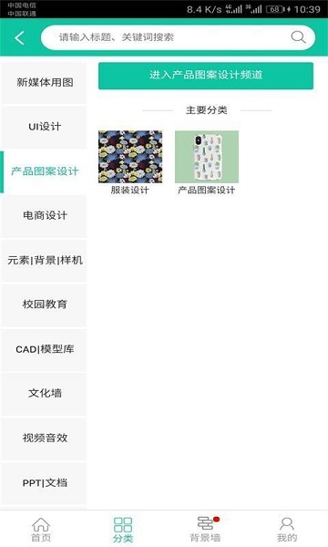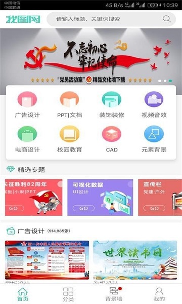 【首页】采用个性化推荐算法,智能展示用户常用模块,包括广告设计、室内装修、电商设计等12个专业领域;【分类】系统细分出38个二级分类和126个三级分类,支持多条件组合筛选;【背景墙】专区提供4K超清背景素材,涵盖现代简约、欧式古典、科技未来等18种风格,所有资源均可商用。
