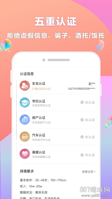 【资产认证】提供多重认证服务,包括学历、房产、车辆等认证。这些认证有助于建立用户信任,提高相亲质量。