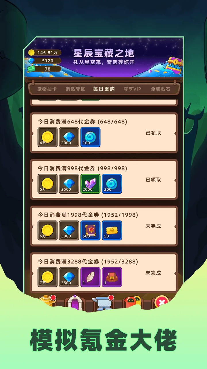 游戏提供了丰富的日常福利,包括登录奖励、在线时长奖励、随机商店等。完成各种任务和成就可获得大量代金券奖励。独特的战斗系统让你在击败敌人时有机会获得稀有道具。游戏还加入了创新的VIP特权系统,让玩家体验挥金如土的感觉。每日达到限额后,所有广告收益都可以直接领取,大大提升了游戏体验。