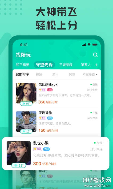 汇聚各大热门手游玩家,根据你的游戏风格,匹配到声音好听、技术超强的大神,小哥哥小姐姐一起超神。系统会根据你的段位、英雄池等数据智能推荐最适合的队友,确保每局游戏都能获得最佳体验。无论是五排上分还是娱乐匹配,都能找到志同道合的伙伴。