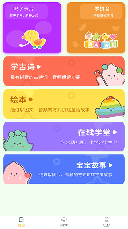 优质的儿童教育识字软件,含有字的启蒙资源,涵盖常用汉字、词语和简单句子;