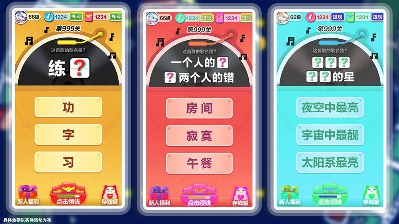 小甜心炮弹红包版以其新颖的猜歌形式和丰厚的红包奖励吸引了大量玩家。每首歌的旋律和节奏都独具特色,确保玩家在游戏中感受到无尽的欢乐。猜歌玩法不仅考验玩家的音乐素养,还带来了前所未有的游戏乐趣。无论是休闲娱乐还是挑战自我,这款游戏都能满足玩家的需求。