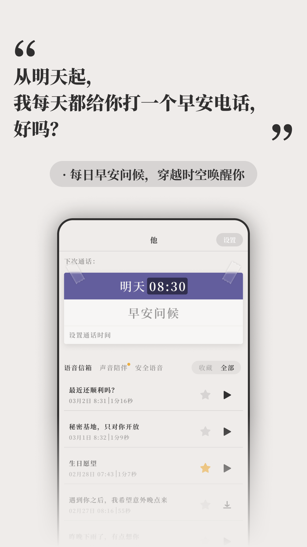 每天清晨准时送上温馨的早安问候,这些充满关怀的语音会自动保存在专属语音信箱中,你可以随时回放重温这份温暖。系统还会根据天气、日期等自动调整问候内容,让每一天的开始都充满惊喜。