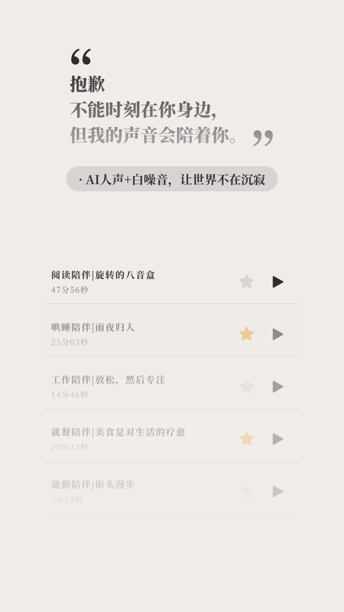 提供工作、通勤、睡前等多种场景的智能陪伴服务。通过AI语音技术结合精心设计的白噪音,为你打造沉浸式的陪伴体验。无论是专注工作时需要的背景音,还是入睡前渴望的舒缓声音,都能在这里找到最合适的陪伴方案。