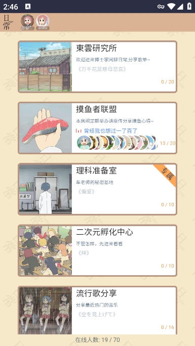 日常聊天室app是一款专为动漫爱好者打造的社交平台,汇聚了海量动漫同好,在这里你可以找到志趣相投的朋友,畅聊热门动漫话题,分享追番心得。平台提供多样化的互动功能,包括语音聊天、兴趣小组等,让你随时随地与网友展开精彩对话。无论是寻找同好还是打发闲暇时光,这款app都能带给你轻松愉悦的社交体验。现在就加入我们,开启你的二次元社交之旅吧!