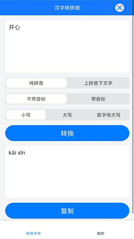 这是一款功能强大的汉字拼音转换和学习工具,支持多种拼音显示方式。用户可以根据需要选择纯拼音、汉字带拼音(上拼音下汉字)等格式,还能自由切换是否显示音标。软件提供大小写转换功能,包括全小写、全大写和首字母大写模式,满足不同场景的使用需求。特别适合正在学习拼音的儿童使用,同时也为家长辅导孩子提供了便利。内置的智能纠错系统能及时指出发音错误,帮助用户快速掌握标准发音。