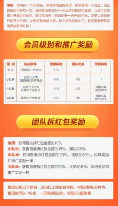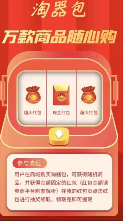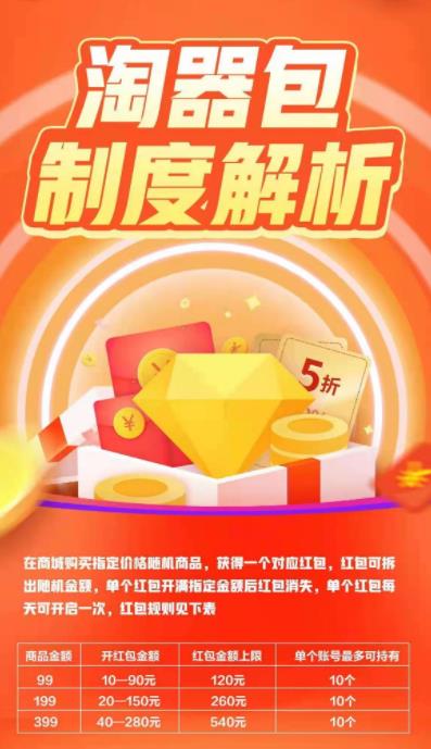你购买-个99商品,你获得商品的同时,额外获得一个红包,该红包每天可开启一次,每次的金额在10--90元之间的随机金额,当这个红包累计开满120元时,该红包消失(假如你第一天开出90元,则第=二天最多只能开出30元,达到红包金额上限,这个红包就消失了。你需要重新购买商品来获得红包)。这种创新的红包机制让每次购物都充满惊喜,同时设置了合理的奖励上限,确保活动的公平性和可持续性。